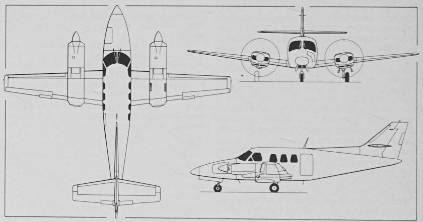 A three-view drawing of the Cessna 421C Golden Eagle.