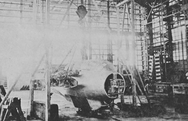 The first J8M1 Shusui airframe to be fitted with an Ro.2 rocket motor at Natsushima prior to delivery to the Yokoku airfield