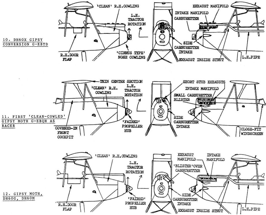 Late production DH.60M Moths at the factory. The centre aircraft has wings folded with jury struts in position supporting the inboard leading edge, exposed fuel tank and wing root section, and 'clean' right side cowling with airscoop at the top. The long doors to the squared-off cockpits are open, as is the locker behind them. Not showing up well are the lines of the wood stringers supporting the fabric shape over the metal fuselage frame. On the right the nose of another aircraft shows the LH tractor propeller, side carburetter intake and opened-up blister cover over the carburetter.