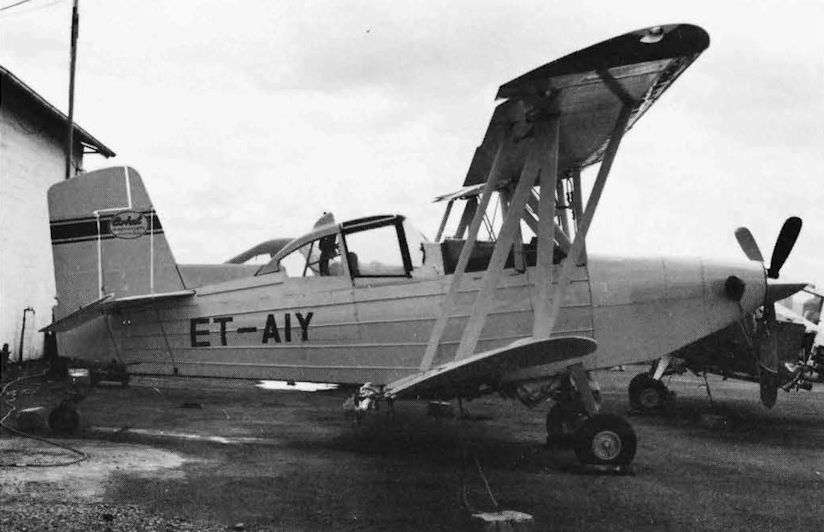 Регистрационный номер: ET-AIY This all-yellow AgCat ET-AIY was the first to be assembled by Ethiopian Airlines under an agreement which could lead to exports to other African states. When photographed at Addis Ababa on 23.1.88 three more aircraft were in various stages of construction and up to a dozen more large crates were in evidence. As with ET-AIY, most are likely to be unsold Schweizer-built production from a few years ago but EAL have had to complete the wings before assembly. The fin bears the name "Eshet - produced in Ethiopia".