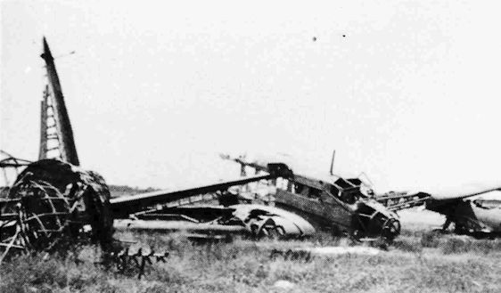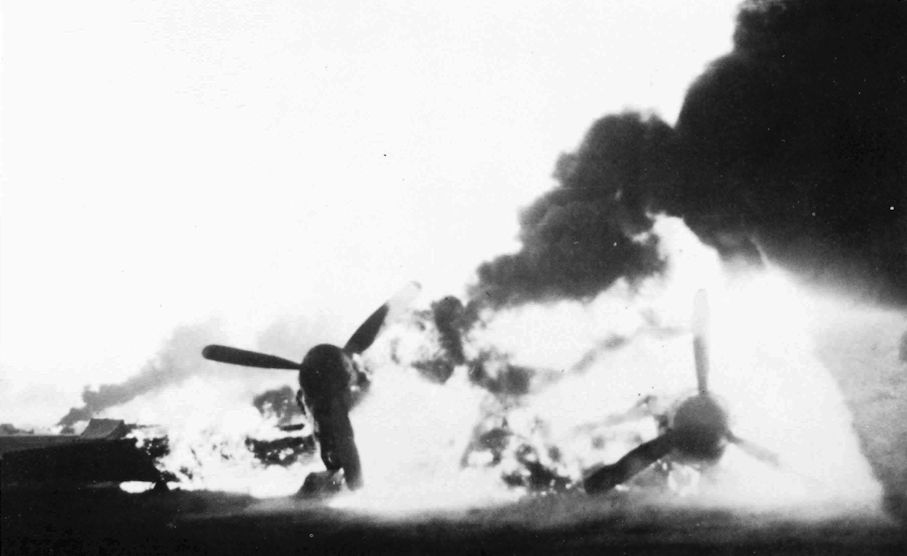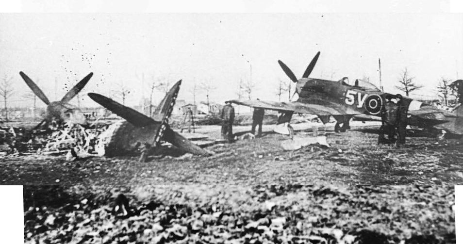 The Luftwaffe's last fling. Operation Bodenplatte, caught many Allied aircraft on the ground as New Year's Day broke in 1945. This shot show's one completely burnt out Typhoon and another of the same unit with a damaged fin. At the time of the attack the unit was stationed at Eindhoven in the Netherlands.