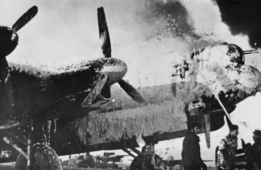 A Lancaster is covered with foam, apparently at Melsbroek and presumably a survivor.