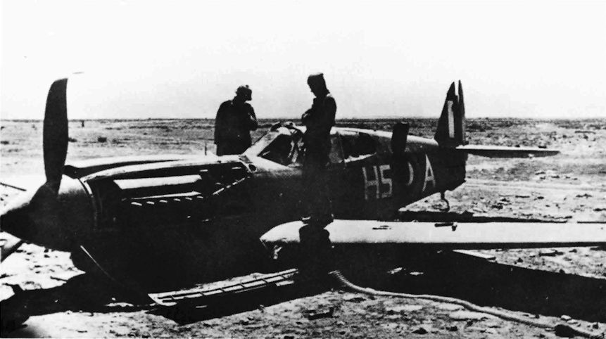 A Kittyhawk I in the Western Desert near Bir Hacheim. It carries the markings of No.260 Squadron but no serial is visible.