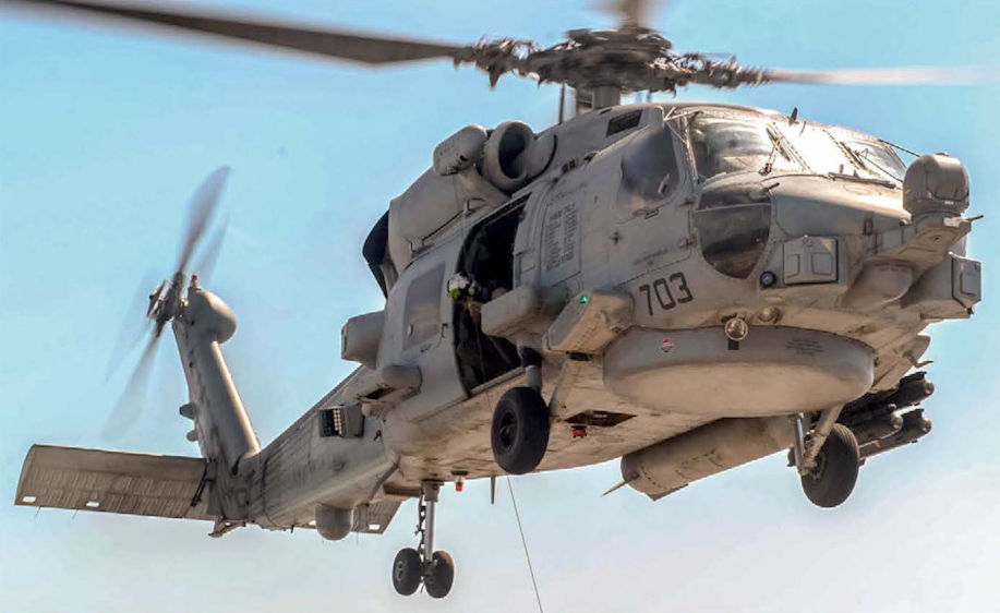 MH-60R из эскадрильи HSM-74, Красное море, 2024 г. По левому борту подвешены УР «Хеллфайр»