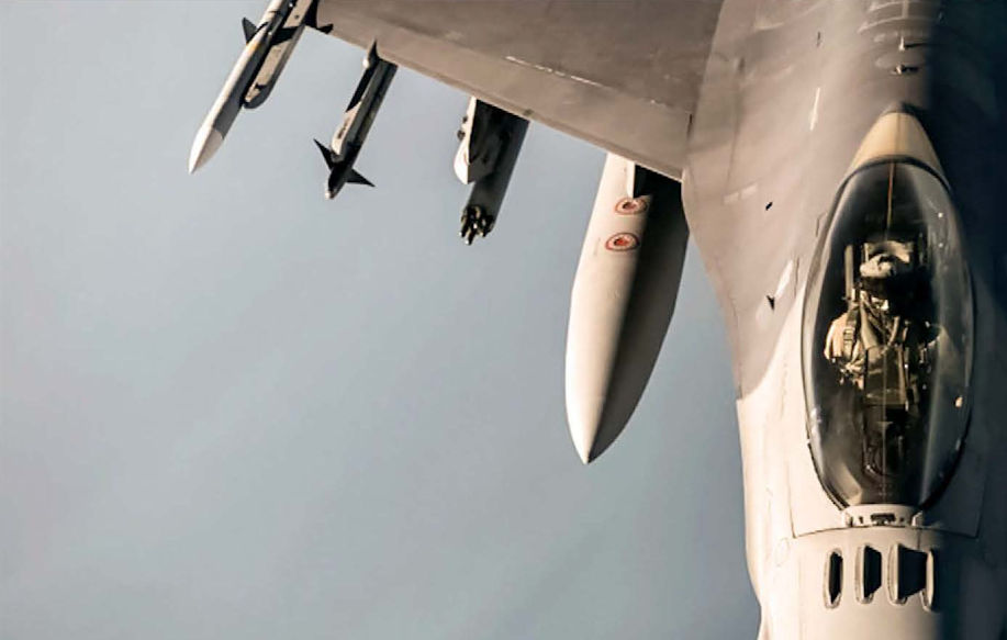 F-16C ВВС США над Красным морем, декабрь 2024 г. На среднем подкрыльевом пилоне подвешен блок LAU-131/A с ракетами AGR-20 APKWS