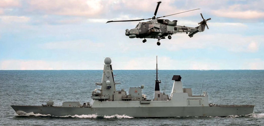 Вертолет «Уайлдкет» HMA2 с ракетами «Мартлет» на фоне эсминца «Даймонд», Красное море, 2024 г