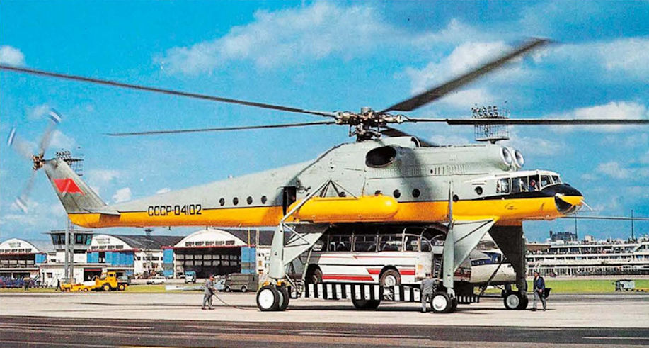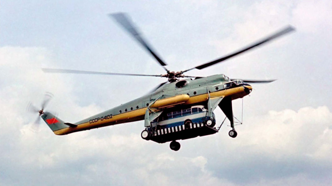 Регистрационный номер: СССР-04102 [5] 23 сентября 1961 года на втором прототипе Ми-10, СССР-04102, был установлен рекорд грузоподъемности - вертолет поднял груз массой 15103 кг на высоту 2200 м. Специально разработан ная грузовая платформа позволяла Ми-10 перевозить на внешней подвеске различные грузы массой до 15 т. На снимке - Ми-10, СССР-04102, перевозит автобус во время авиашоу в Ле Бурже, 1965 год.