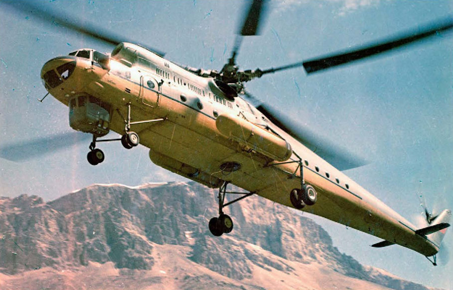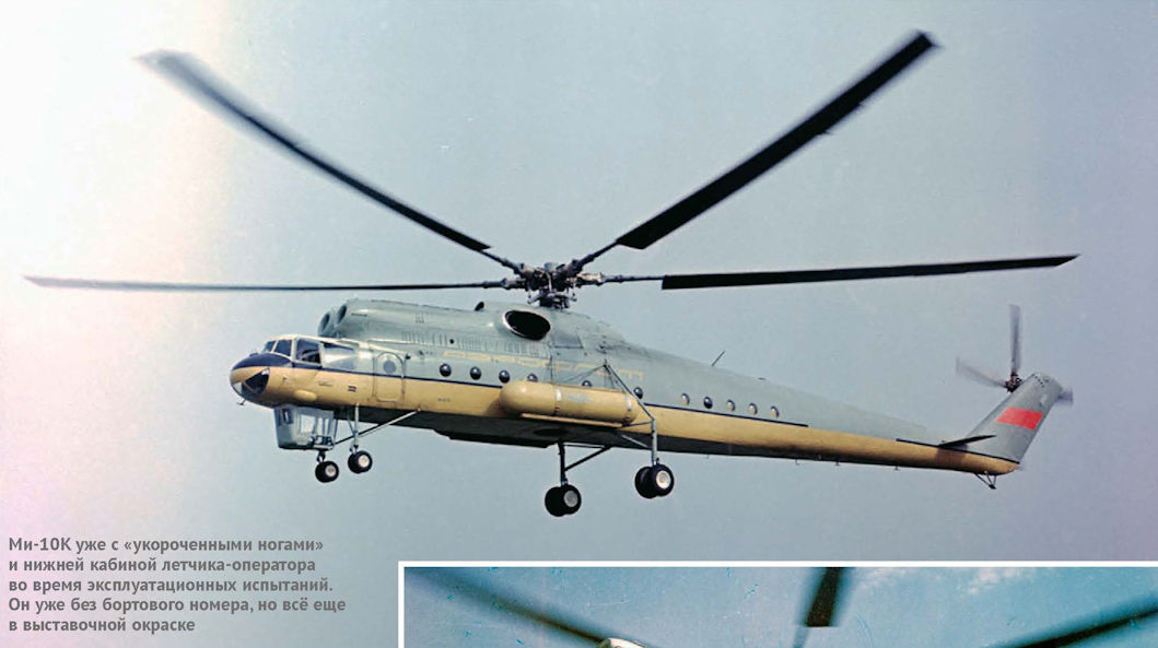 Ми-10К уже с «укороченными ногами» и нижней кабиной летчика-оператора во время эксплуатационных испытаний. Он уже без бортового номера, но всё еще в выставочной окраске