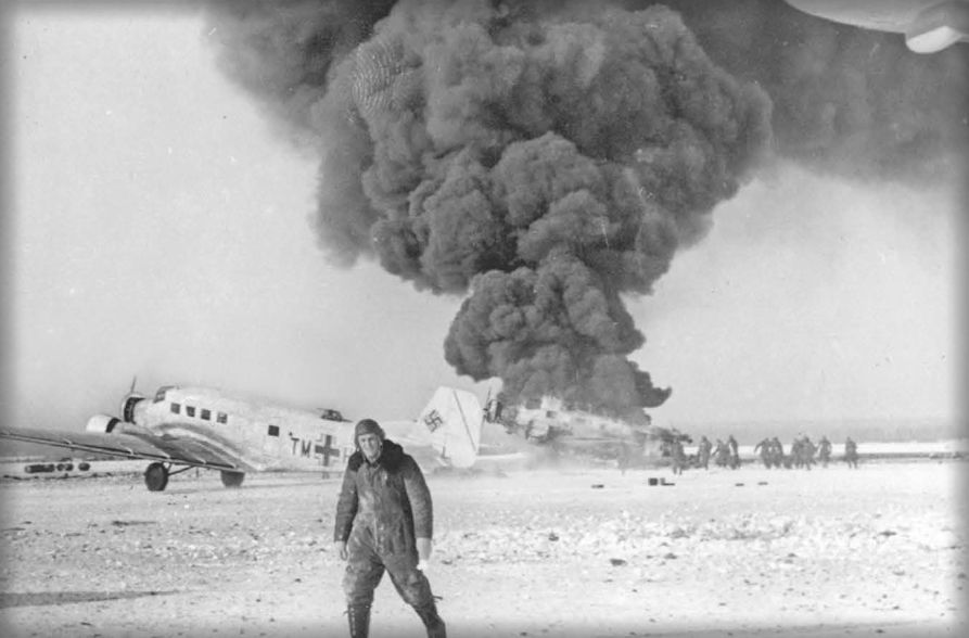 Ю-52 под ударом советской авиации на аэродроме Демянска в марте 1942 г. Большое количество транспортных самолетов противника было уничтожено в районе Демянского и Сталинградских котлов советскими истребителями