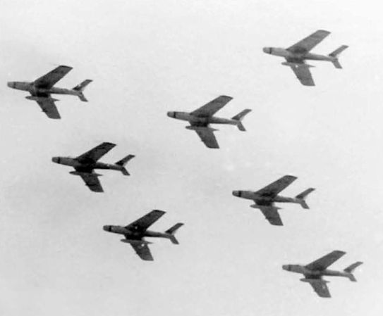 Греческие F-84F в «атомной» конфигурации (с одним подвесным топливным баком, левый подкрыльевой пилон «зарезервирован» для подвески А-бомбы) в полете
