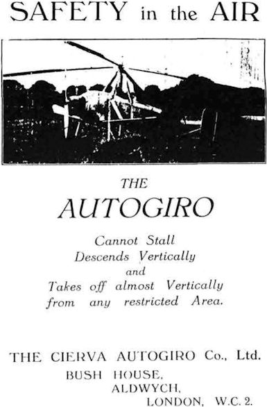 Like the Klemm advert, that used by the Cierva Autogiro Company stressed the safety of their product. The model shown here is the C.19.