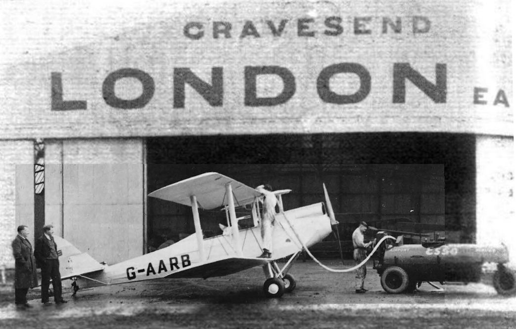 Регистрационный номер: G-AARB PERSONALITIES AND PETROL AT GRAVESEND: The aeroplane in this photograph, seen standing in front of the big hangar (erected by A. and A. J. Law, Ltd.) at Gravesend Airport, is the metal Moth which Miss Jean Batten flew to Australia, and which now belongs tor Mr. Michael Sassoon, who keeps it at Gravesend. It is being refuelled from a T.B. 250-gallon portable unit which Airworthiness, Ltd., have found " to prove worth its weight in gold." In the left foreground are Mr. Garnon, the local Esso representative and Mr. H. C. Brown, manager of Airworthiness Ltd. The Airworthiness workshops are stated to be very busy, while the students of the Company's engineering school are now designing an aeroplane of their own.