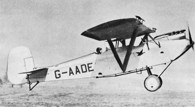 Регистрационный номер: G-AADE G-AADE Westland Widgeon III c/n WA1778 (100 hp Gipsy I 4-cyl upright in-line engine) being held off for landing, a little high perhaps, by its owner C.S.Napier flying solo with the front cockpit empty. With the wing at a high angle of attack near the stall, the Handley Page wingtip slats can be seen in the extended position.