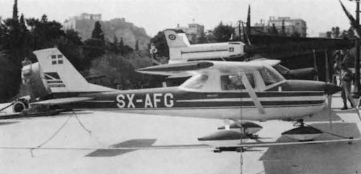 Регистрационный номер: SX-AFG Apparently part of a military display, this Cessna F.150G SX-AFG stands in front of a searchlight and a Nike Hercules missile in Athens on 10.10.68. Observant readers will note that this was nine months prior to the registration date quoted for the aircraft!