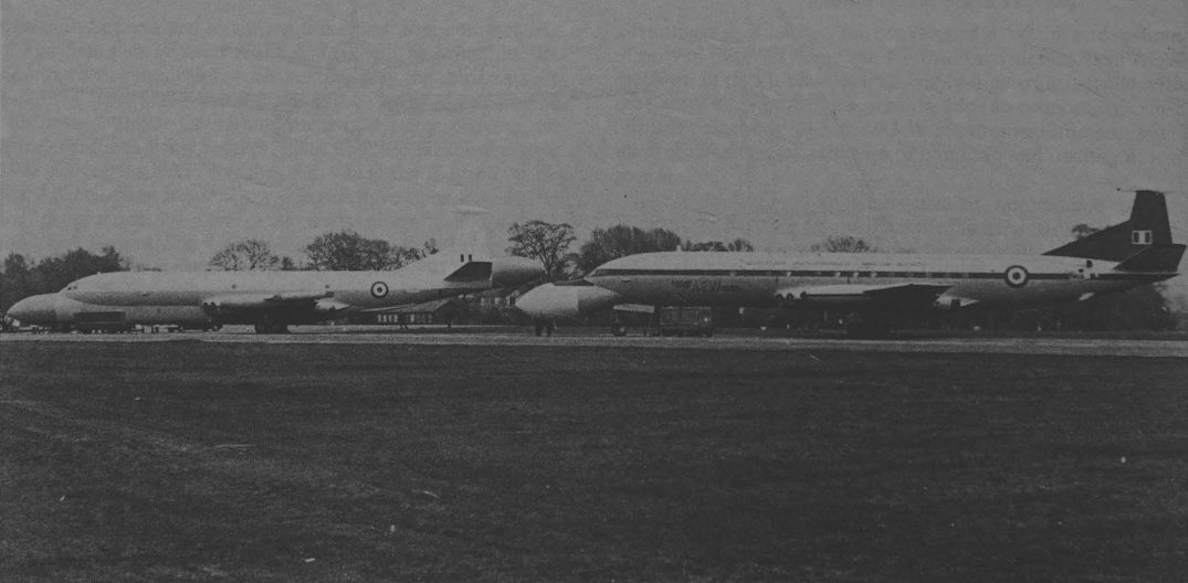 Регистрационный номер: XW626, XZ283 The first Nimrod AEW Mk 3 is seen here together with the Comet Srs 4 (XW626) that has been serving as a flight development platform for Marconi Avionics’ pulsed Doppler radar system. Together with the Nimrod MR Mk 1 (XZ283) fitted with the AEW communications, this has contributed several hundred hours flying to Nimrod AEW Mk 3 development.
