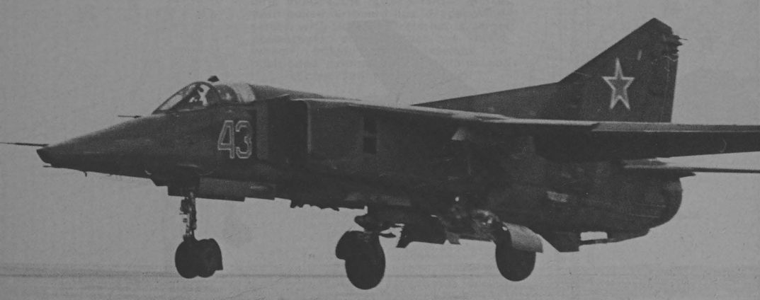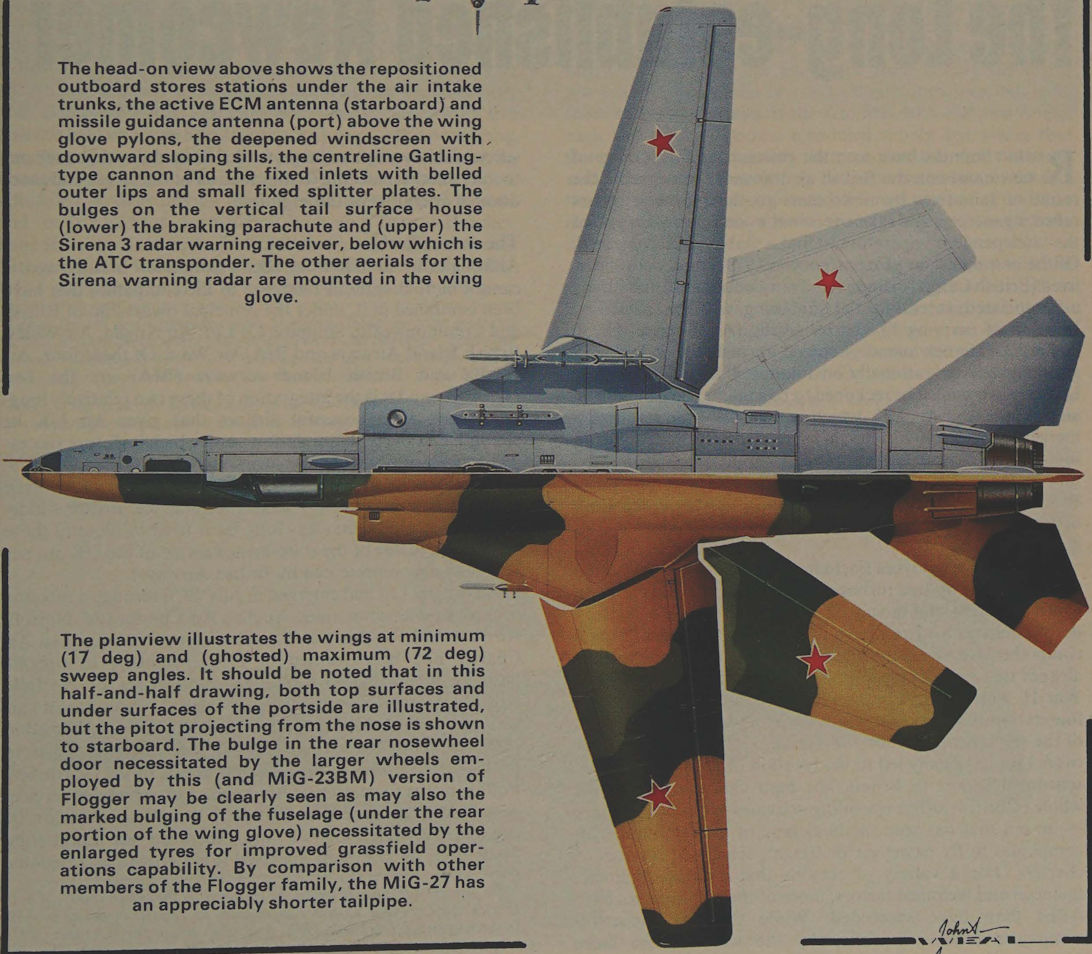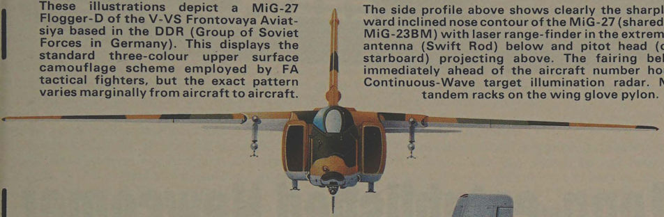MiG-27 Flogger-D ground attack aircraft of a V-VS unit based in the DDR seen with “everything hanging”’. The projection above the starboard glove pylon houses a missile guidance antenna.