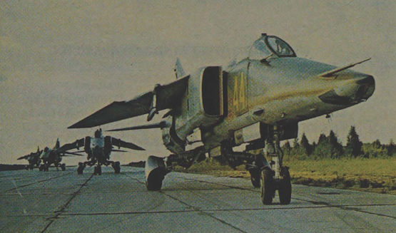 MiG-23MF Flogger-B fighters of a unit participating in the "Karpaty" Exercise in the Cis-Carpathian Military District in the area of Lutsk, Lvov and Rovno. The emblem indicating that the unit has achieved a prescribed standard of excellence may be clearly seen aft of the radome.