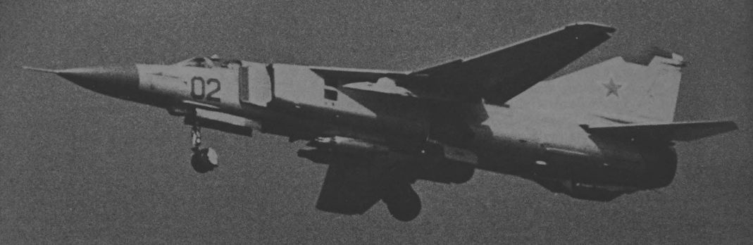 A MiG-23MF Flogger-B photographed in the landing circuit at a V-VS airfield in the DDR. It will be noted that, although sporting air superiority finish, this aircraft carries rocket pods - primarily air-ground ordnance - on the fuselage pylons. The emblem that may just be discerned on the nose denotes a measure of excellence attained by the unit.