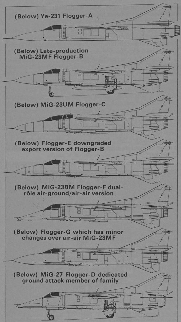 Ye-231 Flogger-A; Late-production MiG-23MF Flogger-B; MiG-23UM Flogger-C; Flogger-E downgraded export version of Flogger-B; MiG-23BM Flogger-F dual-role air-ground/air-air version; Flogger-G which has minor changes over air-air MiG-23MF; MiG-27 Flogger-D dedicated ground attack member of family
