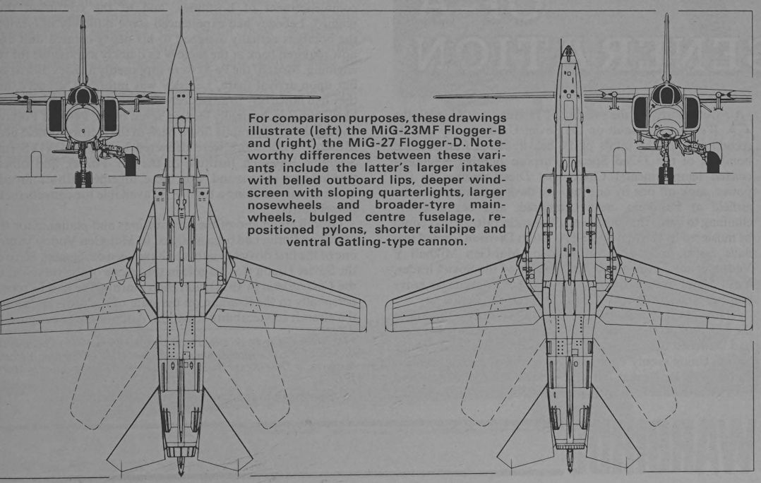 For comparison purposes, these drawings illustrate (left) the MiG-23MF Flogger-B and (right) the MiG-27 Flogger-D. Noteworthy differences between these variants include the latter’s larger intakes with belled outboard lips, deeper windscreen with sloping quarterlights, larger nosewheels and broader-tyre mainwheels, bulged centre fuselage, repositioned pylons, shorter tailpipe and ventral Gatling-type cannon.