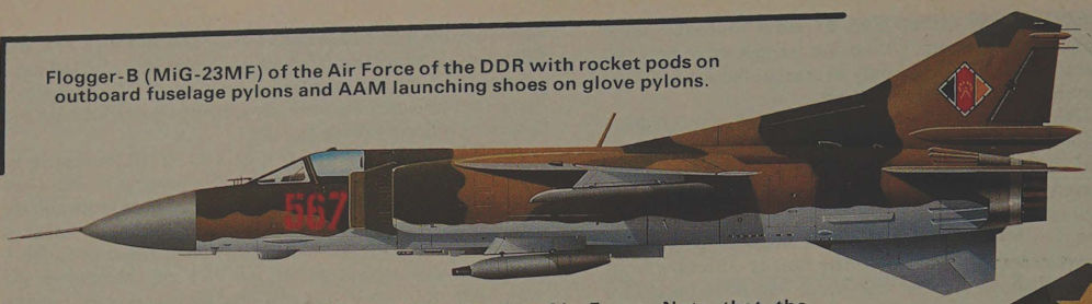 Flogger-B (MiG-23MF) of the Air Force of the DDR with rocket pods on outboard fuselage pylons and AAM launching shoes on glove pylons.