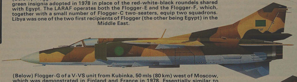 Flogger-E of the Libyan Arab Republic Air Force displaying the Islamic green insignia adopted in 1978 in place of the red-white-black roundels shared with Egypt. The LARAF operates both the Flogger-E and the Flogger-F, which, together with a small number of Flogger-C two-seaters, equip two squadrons. Libya was one of the two first recipients of Flogger (the other being Egypt) in the Middle East.