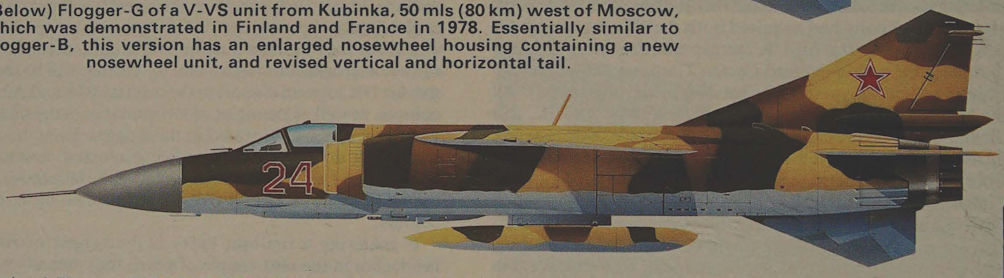 Flogger-G of a V-VS unit from Kubinka, 50 mis (80 km) west of Moscow, which was demonstrated in Finland and France in 1978. Essentially similar to Flogger-B, this version has an enlarged nosewheel housing containing a new nosewheel unit, and revised vertical and horizontal tail.