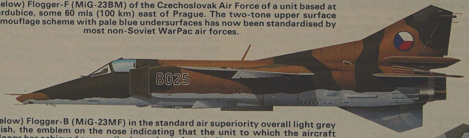 Flogger-F (MiG-23BM) of the Czechoslovak Air Force of a unit based at Pardubice, some 60 mis (100 km) east of Prague. The two-tone upper surface camouflage scheme with pale blue undersurfaces has now been standardised by most non-Soviet WarPac air forces.