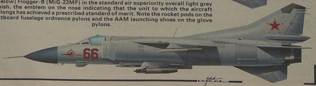 Flogger-B (MiG-23MF) in the standard air superiority overall light grey finish, the emblem on the nose indicating that the unit to which the aircraft belongs has achieved a prescribed standard of merit. Note the rocket pods on the outboard fuselage ordnance pylons and the AAM launching shoes on the glove pylons.