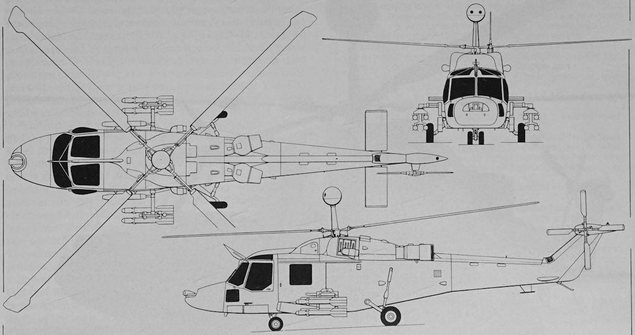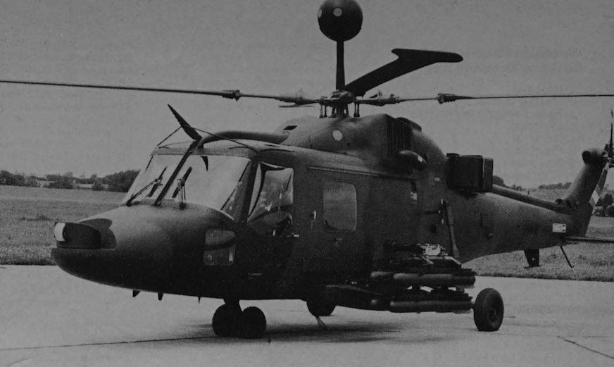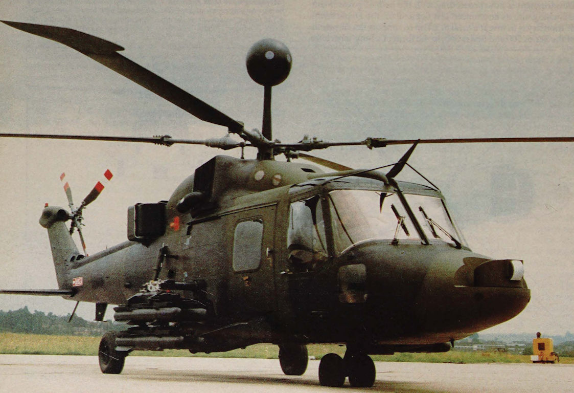 Lynx AH.Mk1 (TOW). Отличные характеристики Lynx побудили военных сделать заказ на создание на его базе противотанковой модификации. Вскоре Lynx был модифицирован под ПТРК TOW - по четыре пусковые установки ПТУР были размещены сбоку от грузовой кабины, а гиростабилизированный прицел M65 - слева на крыше пилотской кабины. Вертолет создавался как многоцелевой и потому имел достаточно просторную кабину, что позволило разместить там восемь запасных ПТУР или боевой расчет ПТРК Milan. Это сделало его более мощным средством борьбы с танками, чем более ранний Scout.