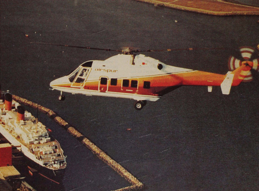 Early operators of the Westland 30 Series 100 are British Airways Helicopters and Airspur. Illustrated is one of the four Series 100 delivered to Airspur in Los Angeles flies over the Queen Mary at Long Beach.
