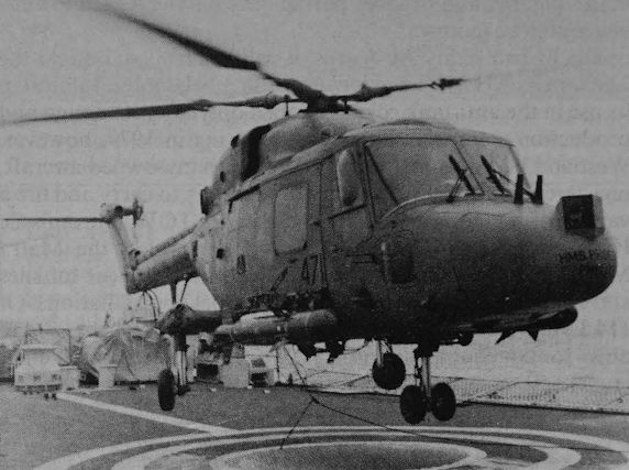 A Lynx HAS Mk 2, in the recently-adopted medium grey finish, carrying a pair of Sea Skua ASMs and with the "Orange Crop" ESM fairing prominent on the nose. Operating from HMS Phoebe, this Lynx is named "Phelix".