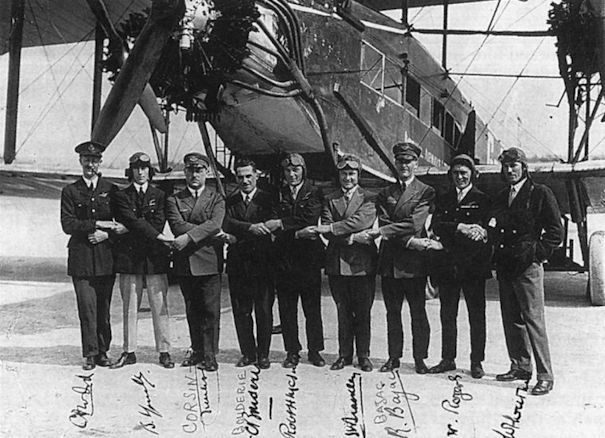 A goodwill lineup of British, Dutch and French pilots in front of an Imperial Airways Argosy at Croydon in 1926; Jimmy Youell is second from left.