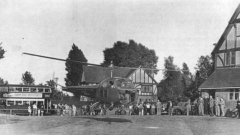 Регистрационный номер: G-AKCX [2] Jimmy lands Bell 47-B2 G-AKCX, registered to Irvin-Bell Helicopter Sales Ltd, in the car park of the Tudor Rose inn in Coulsdon, Surrey, in 1947.