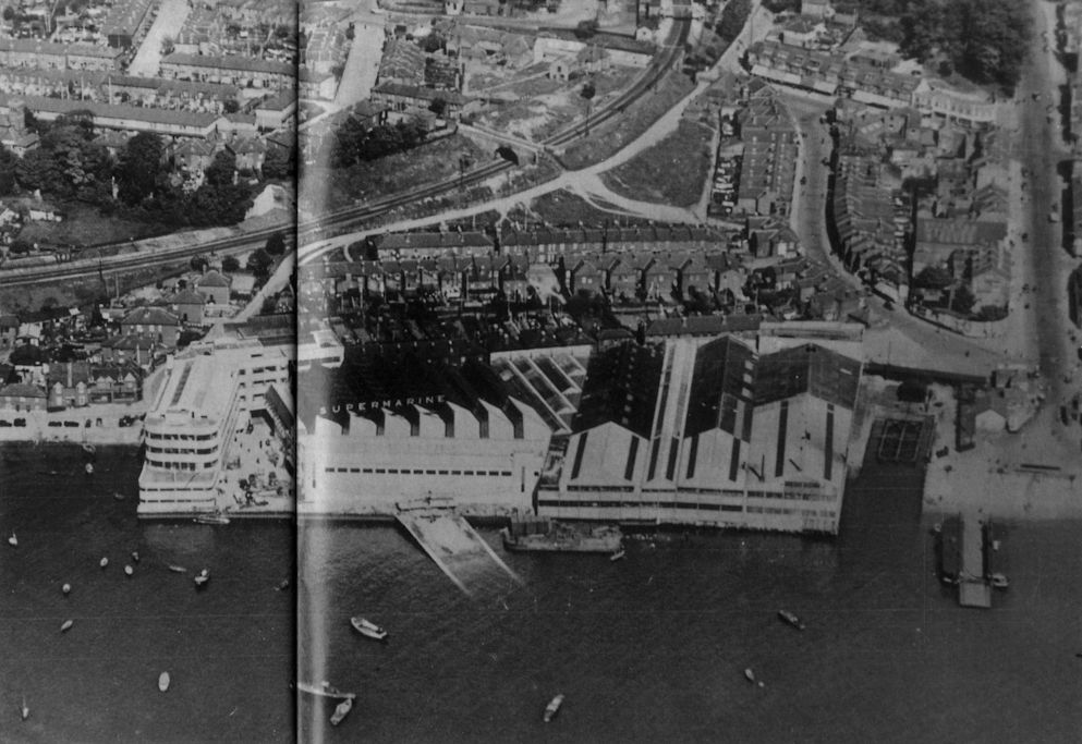 The Woolston works of Vickers-Supermarine as they looked before they were destroyed by bombing in September 1940. A Walrus is at the top of the slipway, and one of the chain ferries across the River Itchen is visible on the right.