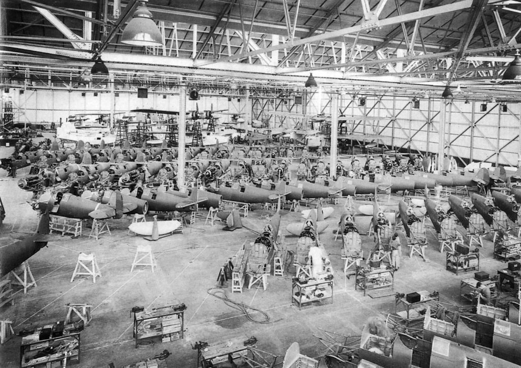 The busy Woolston factory in the late 1930s, with Spitfire fighters, Walrus amphibians and Stranraer flying-boats at various stages of completion. Sixty-four Spitfire fuselages are visible in whole or in part.