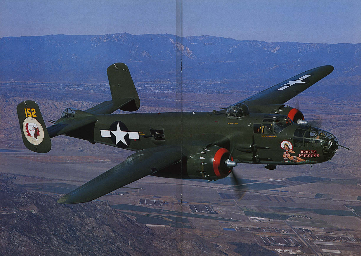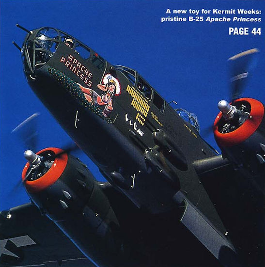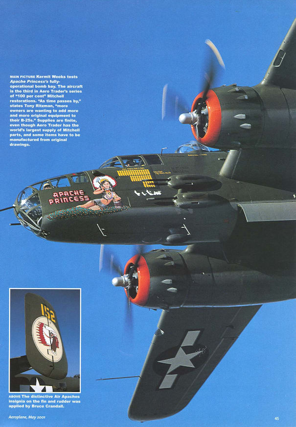Kermit Weeks tests Apache Princess's fully-operational bomb bay. The aircraft is the third in Aero Trader's series of "100 per cent" Mitchell restorations. "As time passes by," states Tony Ritzman, "more owners are wanting to add more and more original equipment to their B-25s." Supplies are finite, even though Aero Trader has the world's largest supply of Mitchell parts, and some items have to be manufactured from original drawings.