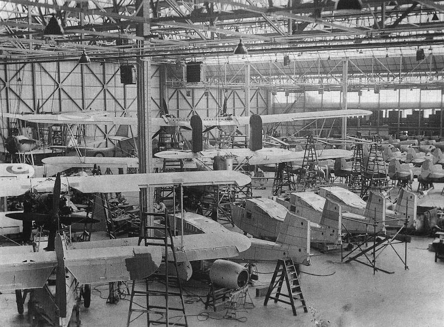 Walrus and Stranraer flying-boats under construction in the Woolston works in the late 1930s, with large numbers of Spitfires being built at right.