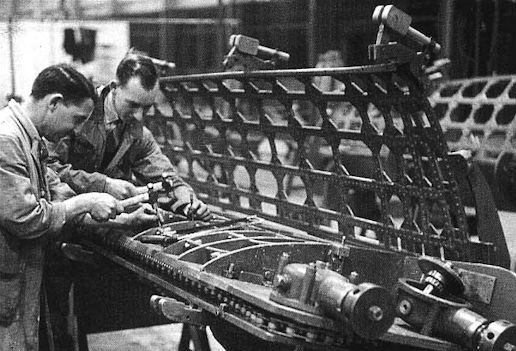 Spitfire factory workers with a special wing-skin drilling jig. The preformed wing leading-edge skin was laid in it, and the upper part clamped down over it to provide a drilling guide for the rivet holes.