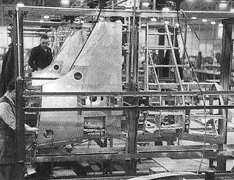 A good illustration of the Spitfire's complex, compound curves: Spitfire rear fuselage/fin assemblies under construction in paired jigs. Note the compressed-air lines for hand tools, descending from overhead reels.