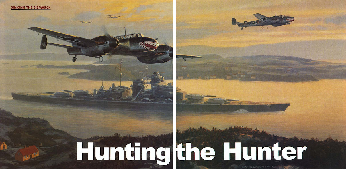Mark Postlethwaite's painting shows the Bismarck leaving Grimstadtfjord, near Bergen, on May 21, 1941, with a Messerschmitt Bf 110 escort.