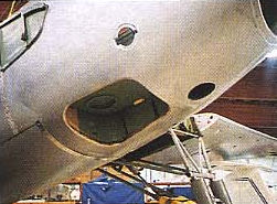 The undernose crew entry showing inner (floor) hatch - outer hatch not yet fitted. Front ends of the bomb doors are held closed by a temporary aluminium strip.