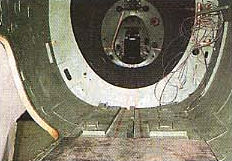 An interior view from the rear of the bomb bay, looking aft. Surplus wiring hangs to the right. For Spartan survey operations the rear cameras and operator's seat were at this aft end of the bomb bay. Opposite the entry hatch (left) was a viewing porthole, since filled in. Interior height here is under 4ft, width less; it was no place for a claustrophobic. And at 30,000ft+, unpressurised, the operator would be dead in minutes if his oxygen failed so, out of sight of the pilot, he had to talk every two minutes, - failing which there was a crash dive to a safer altitude.