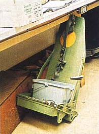 The pilot's seat is currently home to a plastic box full of small spares. Note armour plate backing with, on pilot's left, the armrest and seat height-adjusting lever.