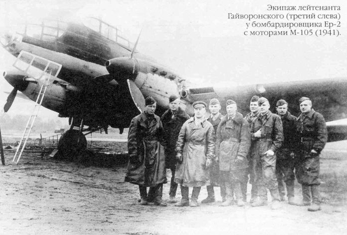 Экипаж лейтенанта Гайворонского (третий слева) у бомбардировщика Ер-2 с моторами М-105 (1941).