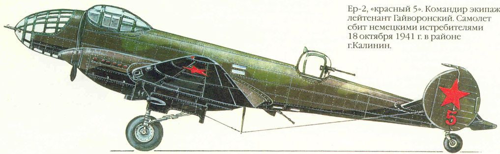 Ер-2, «красный 5». Командир экипажа лейтенант Гайворонский. Самолет сбит немецкими истребителями 18 октября 1941 г. в районе г. Калинин.