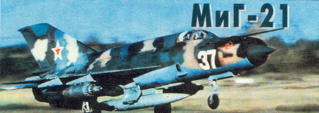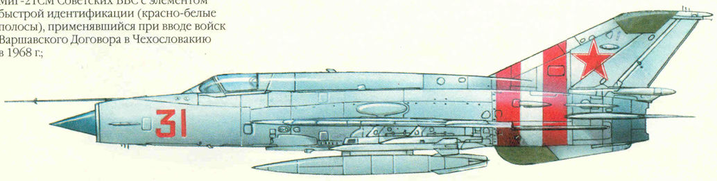 МиГ-21СМ Советских ВВС с элементом быстрой идентификации (красно-белые полосы), применявшийся при вводе войск Варшавского Договора в Чехословакию в 1968 г.;