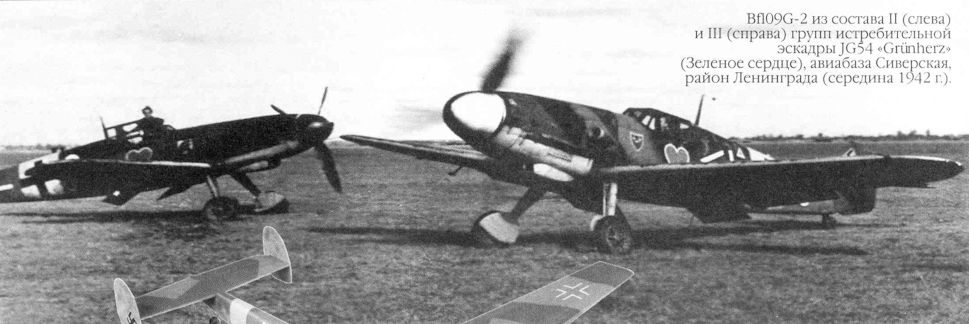 Bf109G-2 из состава II (слева) и III (справа) групп истребительной эскадры JG54 «Grunherz» (Зеленое сердце), авиабаза Сиверская, район Ленинграда (середина 1942 г.).