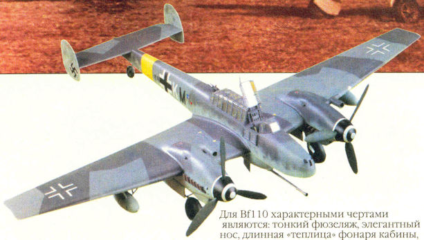 Для Bf110 характерными чертами являются: тонкий фюзеляж, элегантный нос, длинная «теплица» фонаря кабины, широкие прямоугольные плоскости и такое же оперение, увенчанное килевыми шайбами.