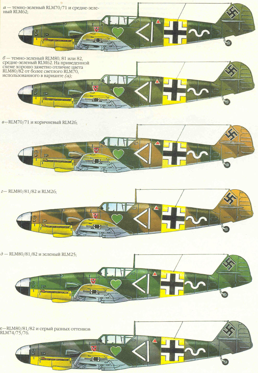 Варианты камуфляжа истребителей Bf 109: а - темно-зеленый RLM70/71 и средне-зеленый RLM62; б - темно-зеленый RLM80, 81 или 82, средне-зеленый RLM62. На приведенной схеме хорошо заметно отличие цвета RLM80/82 от более светлого RLM70, использованного в варианте (а); в - RLM70/71 и коричневый RLM26; г - RLM80/81/82 и RLM26; д - RLM80/81/82 и зеленый RLM25; e - RLM80/81/82 и серый разных оттенков RLM74/75/76.